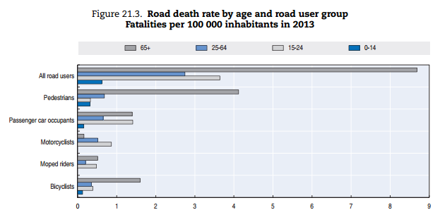 日本の高齢者の歩行事故死の多いのは、道路交通を歩行に(自転車)っ頼っている人口割合が多いにもかかわらず、歩行者保護の道路管理インフラがないと結論付けても間違いがないであろう。