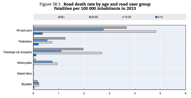 人口10万人当たりの全交通死者数は、日本:4.0、イギリス:2.8、オランダ:3.4 人であるから、このグラフの値はそれぞれの年齢層区分内での10万人当たりの数と見るべきで、年齢の人口構成率によらない値である。