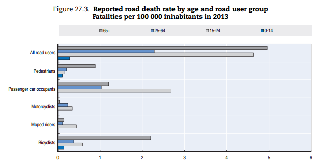 上記グラフの数値表が公表されていないのでグラフから読み取った推定値で見ると、高齢者人口10万人当たりの歩行者の事故死者は日本はイギリスの約3.2倍、自転車はイギリスとの比較で日本は8倍、オランダと比較して日本は0.7倍となる。自転車専用道路が一般化していないイギリスでは高齢者の自転車利用は少ないと見るべきであろう。オランダでは自転車専用の道路など安全インフラが進んでいるがそれでも高齢者にとっては危険な交通手段であることが分かる。