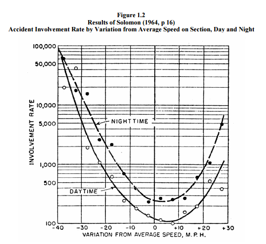 事故確率が最低になる値は平均速度より速く、昼間で約5~10M.P.H.(8km/h-16km/h)としている。