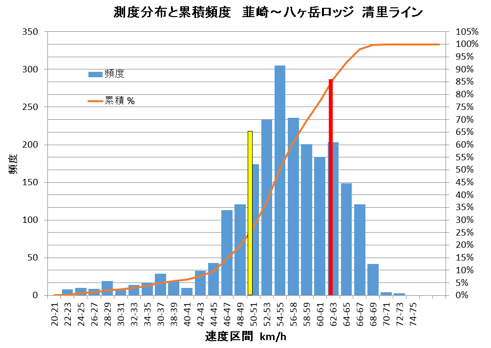 下の走行速度の度数グラフは、韮崎から清里方面40km余りの規制速度50km/h道路で旅行中記録したものである。晴天の午後、渋滞はないが殆ど先行車に追随している場合で、仮にこれを実勢速度とみなすと平均速度54~55km/h、速度分布の最大区間と一致する。これは規制速度(黄色)より5km/hほど早いことになる。