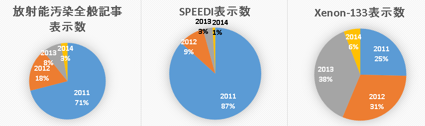 気体や塵など大気中の浮遊微粒子拡散計算システムSPEEDIの結果(2回ほどの公表後政府によって禁止された)。これに関連した記事は、投稿当たりの平均参照数が最も多く2011年度では270回余りであった。しかし、公開禁止になったので新しいデータが無く、2012年以降の表示数が激減した。