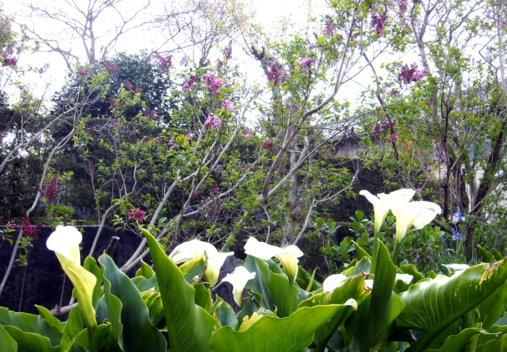 ← 庭の異変か? カラーとチューリップが同時に咲き誇っている
