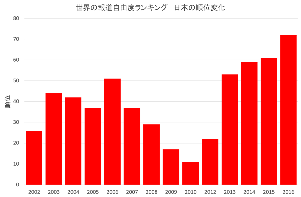 日本も2010年(民主党政権の鳩山内閣当時)まで一桁台の指標が続き世界の中でもトップクラスの順位を誇っていたが、近年の東京電力福島第一原子力発電所事故をはじめとした報道の不透明さや、政府などから開示される情報量の少なさ、記者クラブ制度の閉鎖性、2013年(第2次安倍内閣当時)には政府情報の隠弊を可能にしたとも受け取れる特定秘密保護法の制定などを理由として[7]、年々指標を下げ続けており順位も11位から2016年(第3次安倍内閣)にはついに72位まで落としている[8]。また、右図から見ても日本は「問題な状態」に指定されていることが分かる。先進国の中では特に悪い状態で、G7の中では最下位まで転落した。