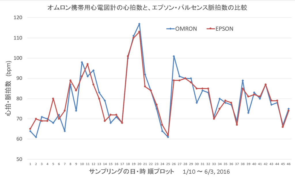 オムロンの値は心電図に記載されている心拍数、エプソンのデータはライフログのグラフから。