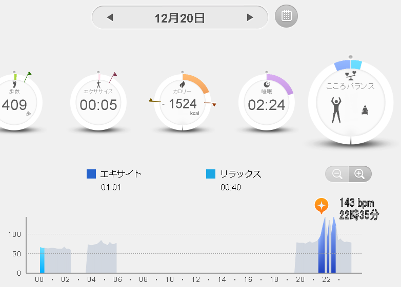 ライフログ・グラフの記録に表示された、脈拍数: 143 bpm, 22時35分