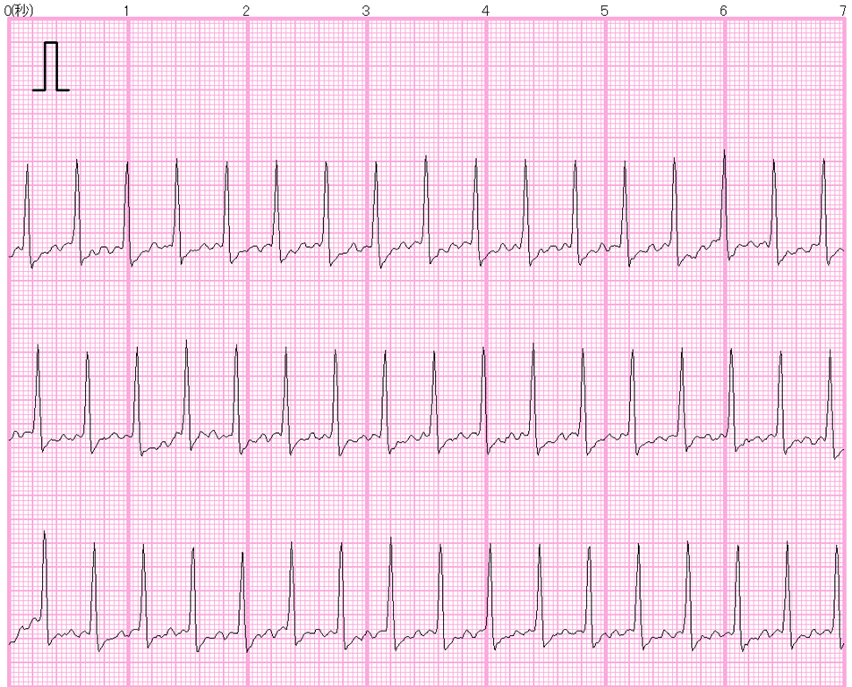 下図は、オムロンの心電計(HCG-801)で記録した同日22時32分21秒に計った心電図の最初の20秒間をコピーしたものである。