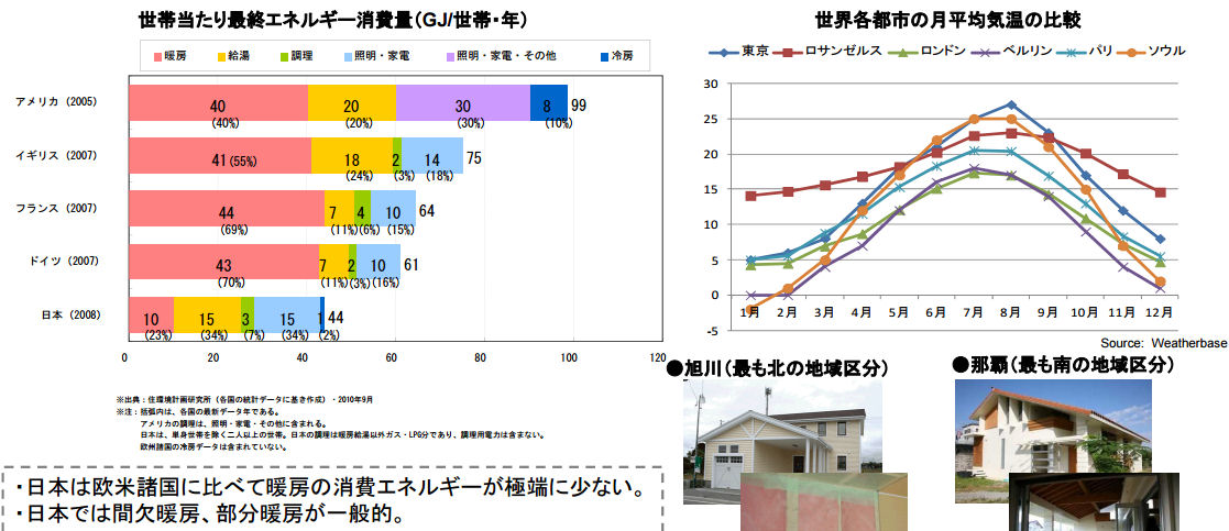 気温で見ると、冬の寒さは、日本、ロンドン、パリ、それほど変わらない。しかし日本の暖房エネルギー消費は極端に少ない。