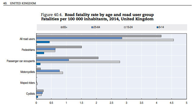 乗用車乗車中の死者は、日本は何れの年齢層についてもイギリスより少ないのです。日本の自動車乗車中の人口当たりの死亡事故率は既に2014年には世界一の安全を達成しているのです。