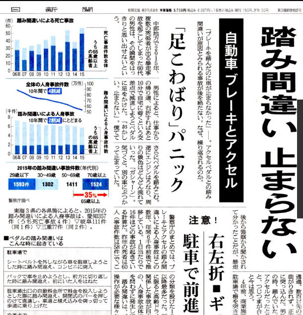 新聞報道 自動車ブレーキとアクセルペダルの踏み違い