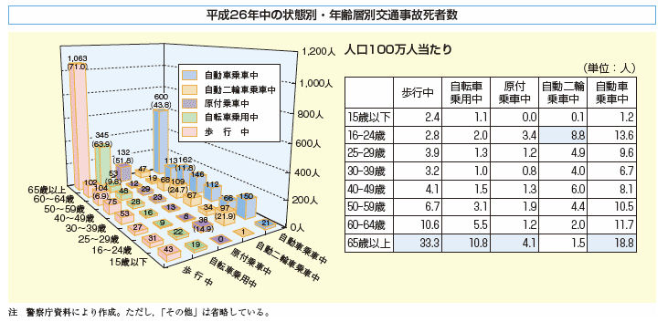 高齢者交通事故死者率の最も高いのは歩行中と自転車乗車中である。65歳以上の場合、歩行中の死者数は自動車乗車中の1.8倍、歩行と自転車利用中の死者数は自動車乗車中の2.3倍にもなる。