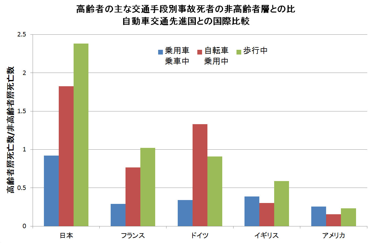 日本は世界一高齢化の進んだ国とは云え日本の高齢者交通事故死者の割合は、自転車と歩行で人口比に比べ大きく開いている。ヨーロッパの国々でも同様の傾向がみられるが日本ほど極端ではない、ドイツでは自転車事故死者が突出しているが事情は分からない。