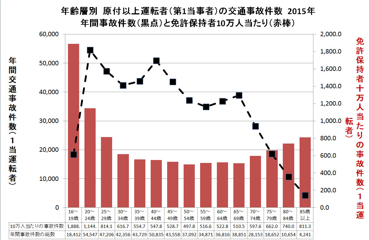 黒の正方形マークが2015年の年間事故件数の年齢層別分布である。これが実勢社会の事故災害の規模を表すもので、これが議論すべき基本資料であると思う。