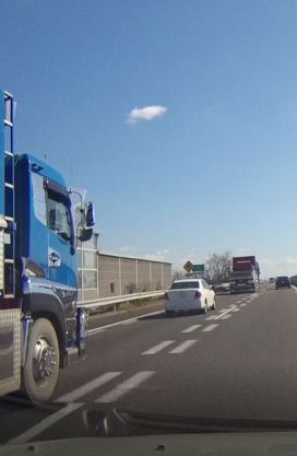 下の映像は、私が使用している車(2013年型ボルボV4セーフティー装備装着)から見た現状。追い越し車線を110km/hで走行中のドライブレコーダーの映像から。