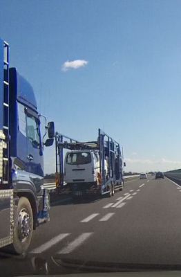 右側の2台のトラックに挟まれた乗用車、前方のトラックが何らかの原因で減速し、後ろのトラックに追突されたら生還の望みはないでしょう。走行車線の走行速度は80km/h程度と推定される状況の場合である。