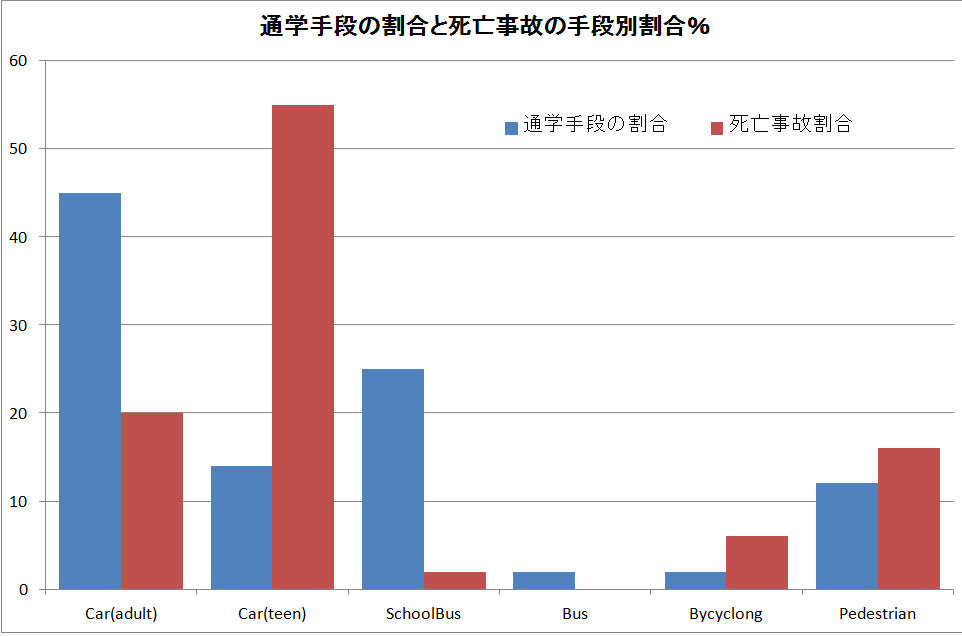 下はアメリカの例で、登校は保護者による乗用車での送り迎えかスクールバス利用が80%以上、自転車と歩行は15%程度である。驚くことにこの調査の記載では児童生徒の兄弟であろうか、10代の運転者による乗用車同乗とその死亡事故の割合の大きいことである。