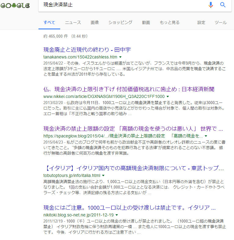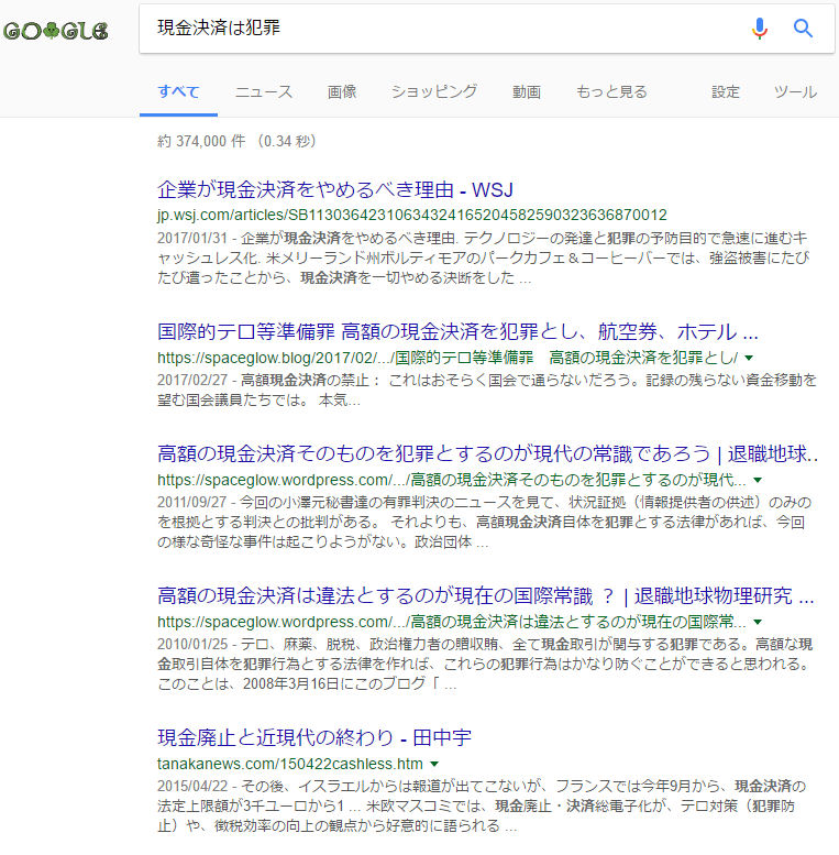 検索語句「現金決済は犯罪」では第1ページ目上位5位中3タイトル、spaceglow.blogおよびsoaceglow.wordpress 。2017/3/17 19:00