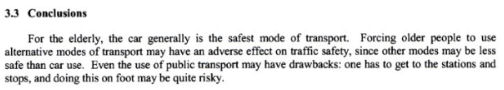 さらにこのレポートでは結論として、高齢者の乗用車利用は最も安全な交通モードである。安全のために、高齢者に乗用車でなく他の交通手段を利用するよう強引に推し進めることは、より危険をはらむことになろう。そのうえ、公共交通機関を利用することはかえって停車場までや、降車後に必要となる歩行は極めて危険な手段である。