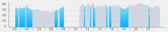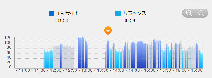 5月11日、10時30分より16時まで、名神高速道、名古屋市内高速を含む往復70kmの外出。東名高速(100~115km/h走行時)を含む状態でも脈拍80bpmを超すのはほんの稀で興奮状態(紺色)は記録されていない。