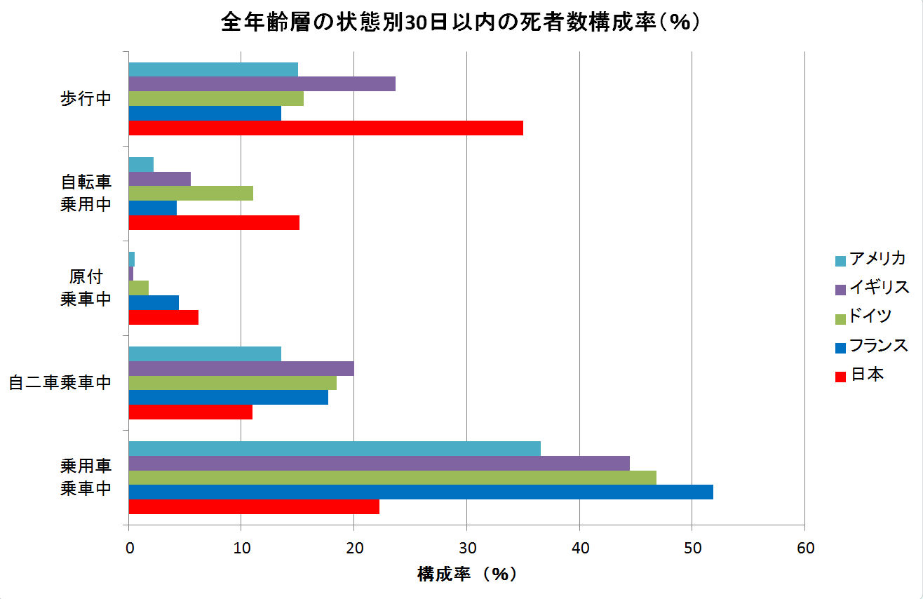 2014~2016年の各国について交通の手段別事故死者の構成率を比較したものが下のグラフである。日本は歩行中の死者が最も多く、続いて自転車である。自動車乗車中は諸外国に比べて半分以下である。
