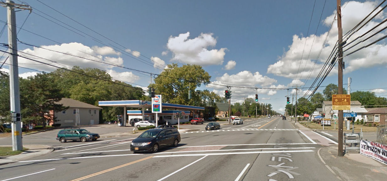 上段の画像はアイダホ州(西部)ポールに設置された進行帯別の信号、道路中央縦長の信号は左折信号付きのもの。下段はニューヨーク州(東部)の典型的な例で信号灯がワイヤーでつられ交差点中央に伝統的?な四方表示灯が吊り下がっている。いずれの場合も進行方向車線前方に信号が表示され紛らわしい反対車線の信号は見えないようになっている。間違えようがない。