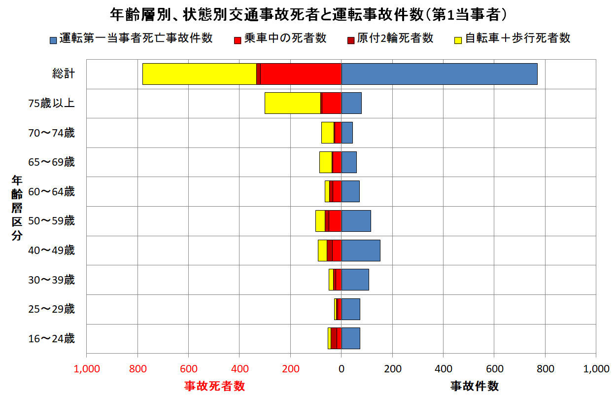 特に75歳以上の年齢層では、運転者の遭遇する第一当事者事故件数に比べ死亡者数が圧倒的に多いことである。このことから、高齢者の運転免許を厳しくし、乗用車利用を困難にすることは社会全体の事故死者を増加させることになり、しかも不幸にして高齢者の死亡事故に遭遇する運転者の大部分は65歳以下の社会活動中であるという事実を認識することである。