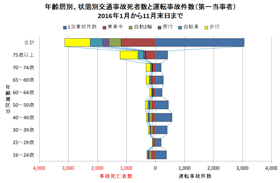 下のグラフは2016年度1月から11月までの年齢層別に見た死亡事故にかかわった第一当事者の事故件数から同年齢層の交通事故死者数を引いたものである。赤色が被害死亡者数の方が多い状態を表し、青色が加害事故件数の方が多い場合である。