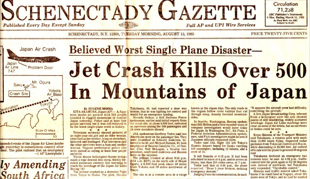 私は、ちょうどこの1週間ほど前、夏休みを利用してニュヨーク州立大学(SUNA)に研究出張し滞在していた。この新聞は同僚が持ってきてくれたものである。アメリカ国内線でも重要な移動の足となっていたボーイング747(ジャンボ機)、教育程度が高くアメリカ国内での移動が日常的な職業についている人たちには他人事とは思えない事故であった。テレビニュースでも時間を割いて特別番組を組んでいた。ヘリコプターで釣り上げられる生存者の映像、遭難者が機内で書き留めた家族への別れのメモを英訳して読み上げるなど涙をそそるニュースが数日続いた。