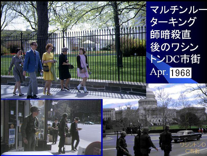 私が見た暴動事件、公民権運動のマルチン・ルーターキング 牧師の暗殺に絡むワシントンDCでの暴動。当時アイダホ大学に勤務、春の学会のためワシントンに出張する前夜航空会社から電話、予約してあった便は空港に夜着くことになり夜間禁止令のため空港から出られないどうするかの問い合わせ。次の日の昼間に着く便に変更したことを思い出す。下の組み写真はその時のワシントン市街の様子。ホワイトハウス前、家族連れの観光客か良き時代を思わせる穏やかな風景と同時に、連邦議事堂前の道路をパトロールする軍隊、そればかりか下段左は閉店命令で閉まっている酒屋を兵隊が守っていた。