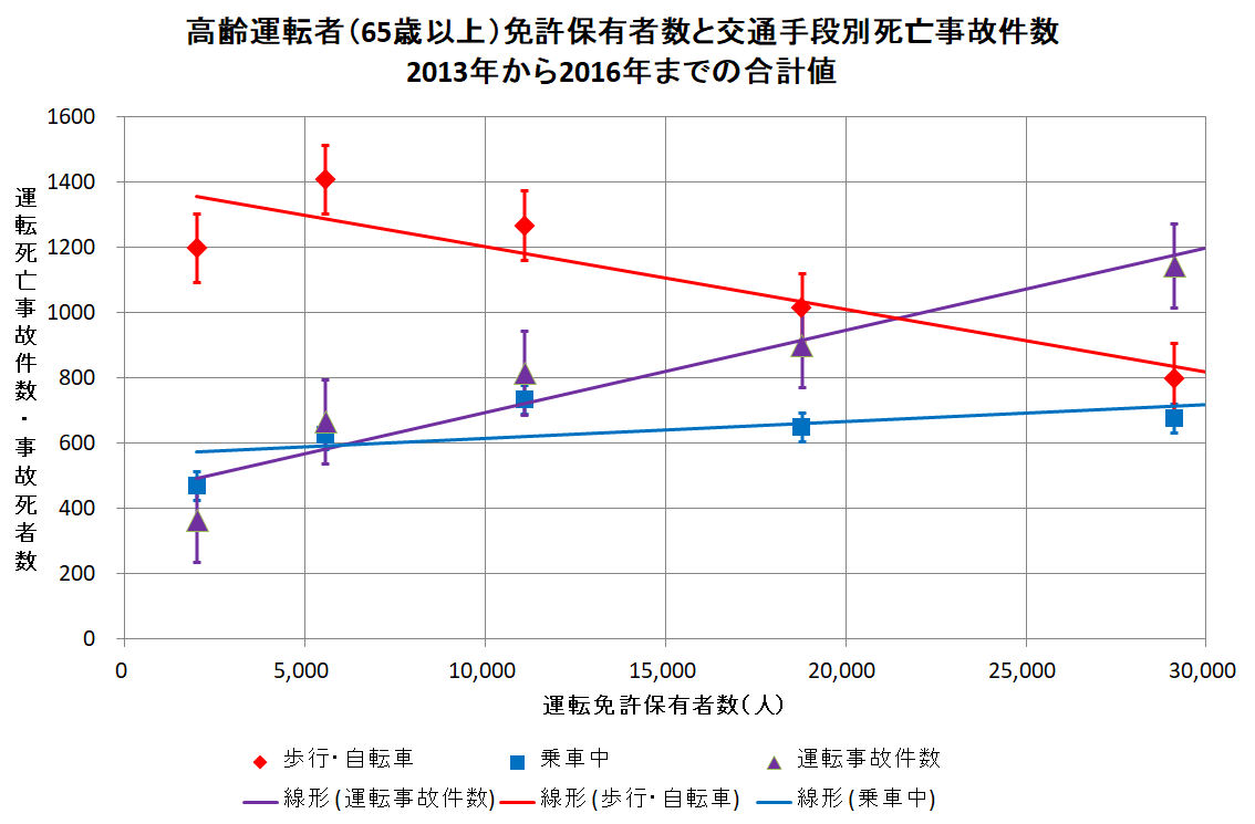 下のグラフは、2013年から2016年までの4年間の65歳以上の運転免許保有者数に対する交通手段別死亡数の相関図である。e-Stat警察庁データベースによる。