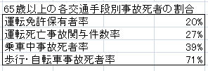 顕著な事実は、65歳以上年齢層の歩行・自転車事利用故死亡者は、同利用全年齢層の71%にもなっていて交通事故死亡災害の最大要素である。それにくらべ65歳以上の責任の重い第1当事者死亡事故件数は27%である。