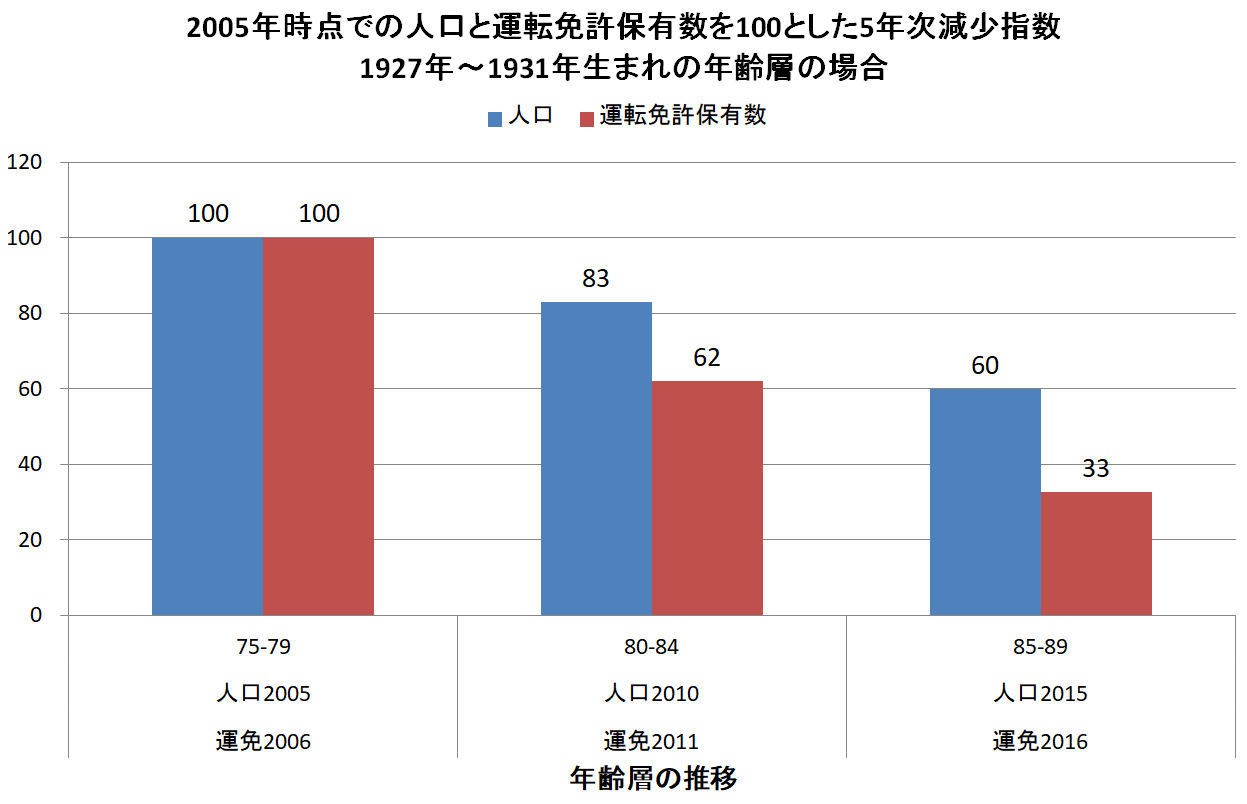 下のグラフは、追跡した年齢層の人口や運転免許数の減少について、2005年の人口を100とした(運転免許は2006年)指数で見たものである。病気などの死亡による人口減少とそれに伴う運転免許保持者の減少がみられるが、それに加え高齢になるに従い免許更新を放棄する傾向がみられる。