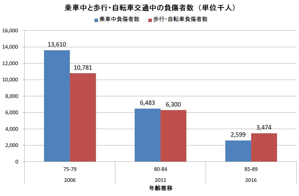 まず、この年齢層の人たちが自動車乗車中と歩行又は自転車交通の死亡事故数の実態を見てみよう。
