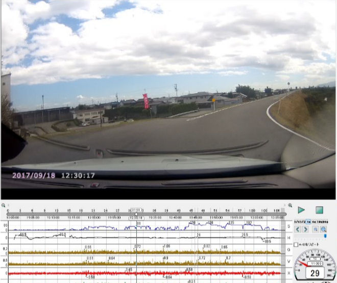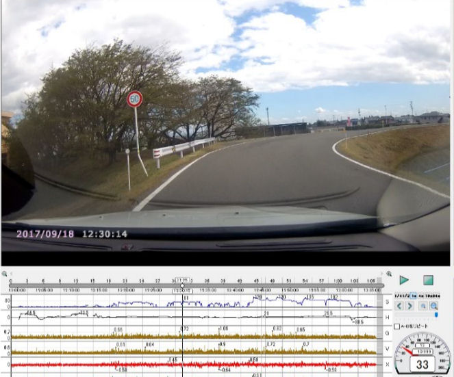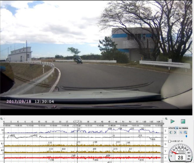 画像2: カーブ走行中前方オートバイに注目しはみ出さないよう33/km/hに減速。道程 90m、 時間 7秒、 走行速度 28km/h、減速 33>28km/h/7sec(0.3G)