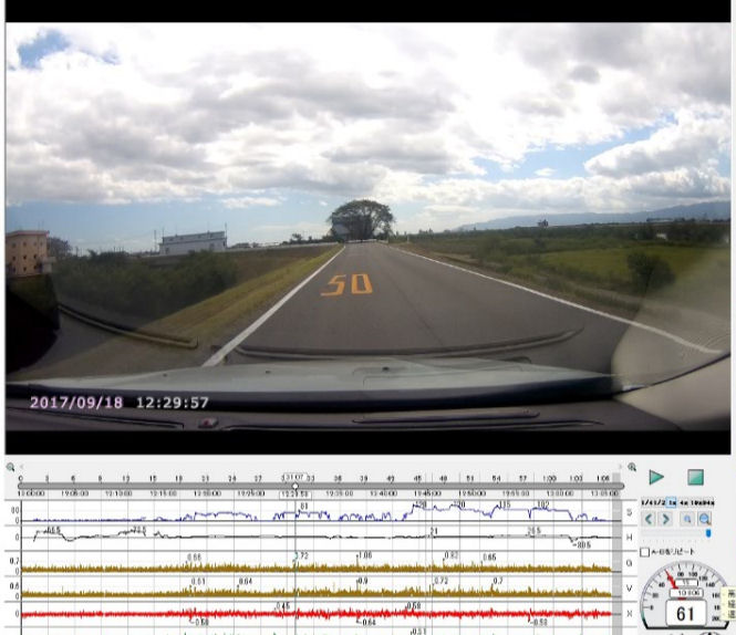 画像1: 61km/hで走行中、50(50km/h?)の路面標識と路面前方の急カーブを見て減速開始。道程 0m、 時間 0秒、 走行速度 61km/h