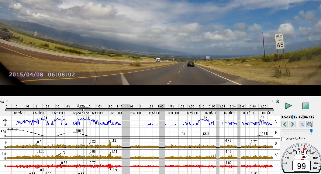 ここマウイ島では、このような設備の良い道路でもかなり遅めの速度制限標識が見られる。外来の観光客の多いこともあって、どの程度の速度超過が普通なのかわからない。運転は、できるだけ前方の車に一定の車間距離で追随するようにした。下の映像はその記録の1例で、制限速度45MPH(72km/h)に対してこの時の走行速度は99km/hであった。日本とほぼ同じような状況だが、私の経験では、こんな乖離はアメリカ本土やヨーロッパでは摘発される速度超過と感じた。