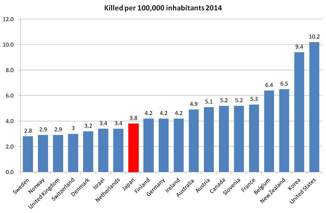 順位では8番目であるが、この数は自動車乗車中事故死以外の総ての交通死者数であり、日本で特に多い歩行者と自転車の死者を含んだものである。これを除くと日本の乗車中事故は世界一少なくなる。(前ブログ記事等)