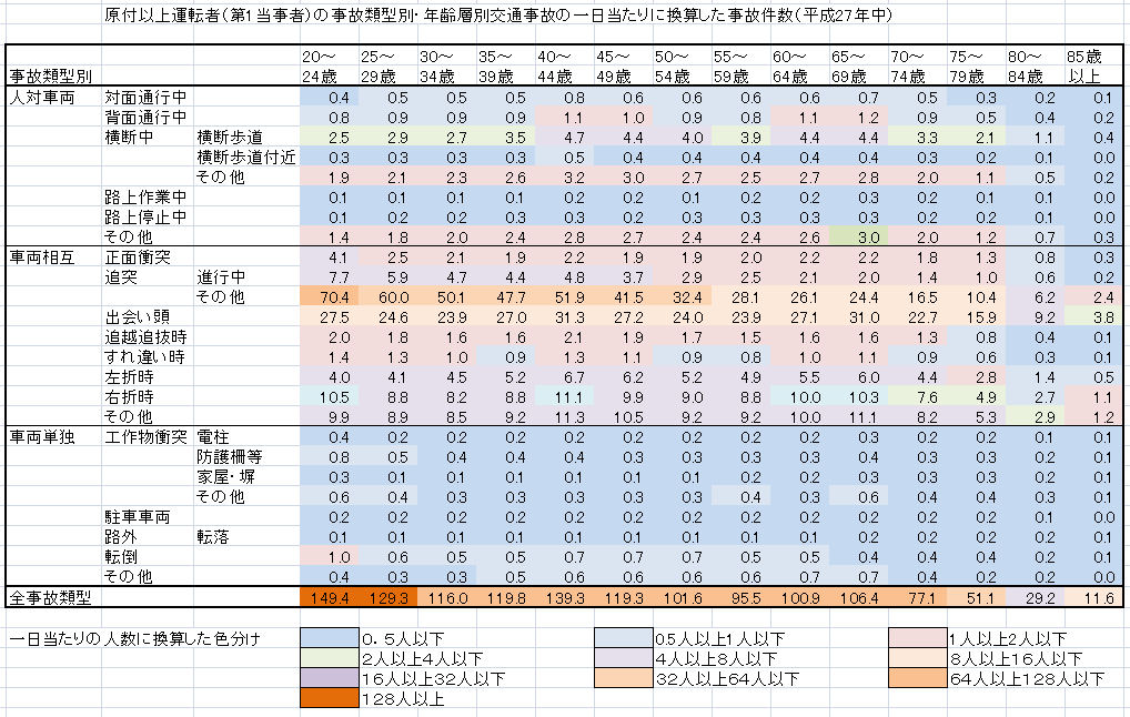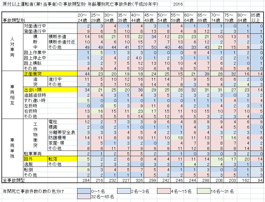 運転者(第一当事者)の死亡事故件数に限ると類型別・年齢層別に分けた場合、多くのセル個々では統計的に信頼に当たらない少さな数値となる。
