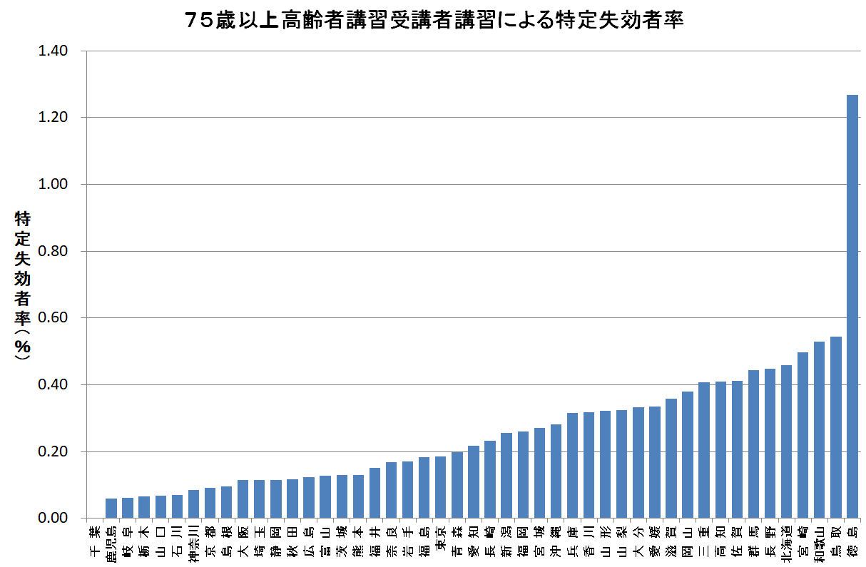 下のグラフは講習(認知症テスト)の結果、免許が失効した人の割合の自治体別グラフである。一人も失効者を出さなかった千葉県、0.1%以下の鹿児島、岐阜県、最大は徳島県の1.3%まで10倍以上の差異が見られる。運転免許統計 28年版 https://www.npa.go.jp/toukei/menkyo/index.htm