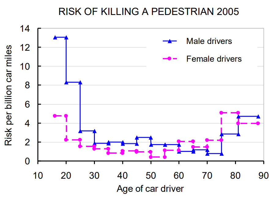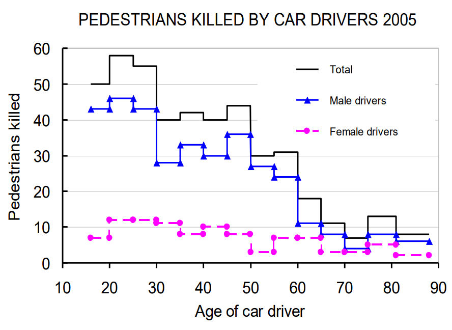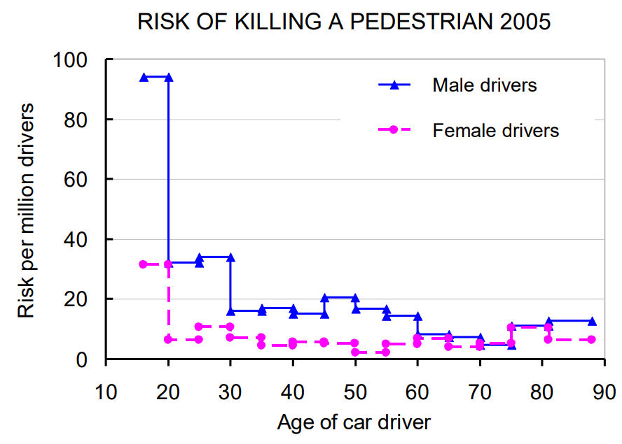 年齢層別運転者による歩行者の年間死亡事故数。高齢運転者が歩行者の脅威ではないことがはっきり示されている。下のグラフは実勢社会のものであり、壮年運転者が圧倒的に多い場合である。どんなに高齢化が進んでも高齢者の運転者数が壮年層と同じと見る仮想的な状況はありえない。したがって、よく表される運転者10万人当たりの統計量は社会的には意味がない。