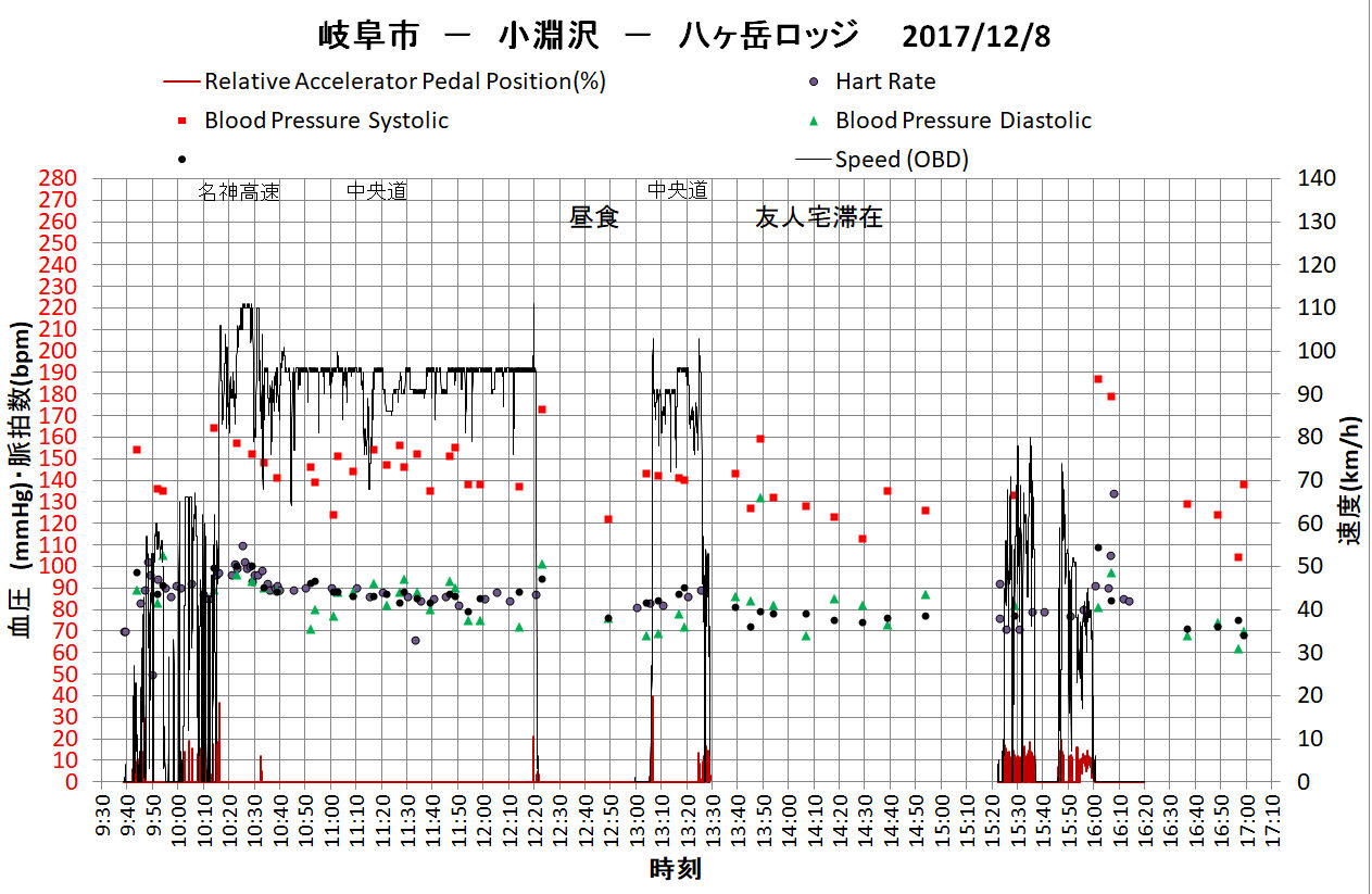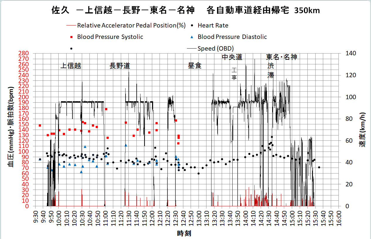 名神、東名高速道、中央、長野、上信越自動車道走行時の速度記録と血圧・脈拍数の変化を記録した。