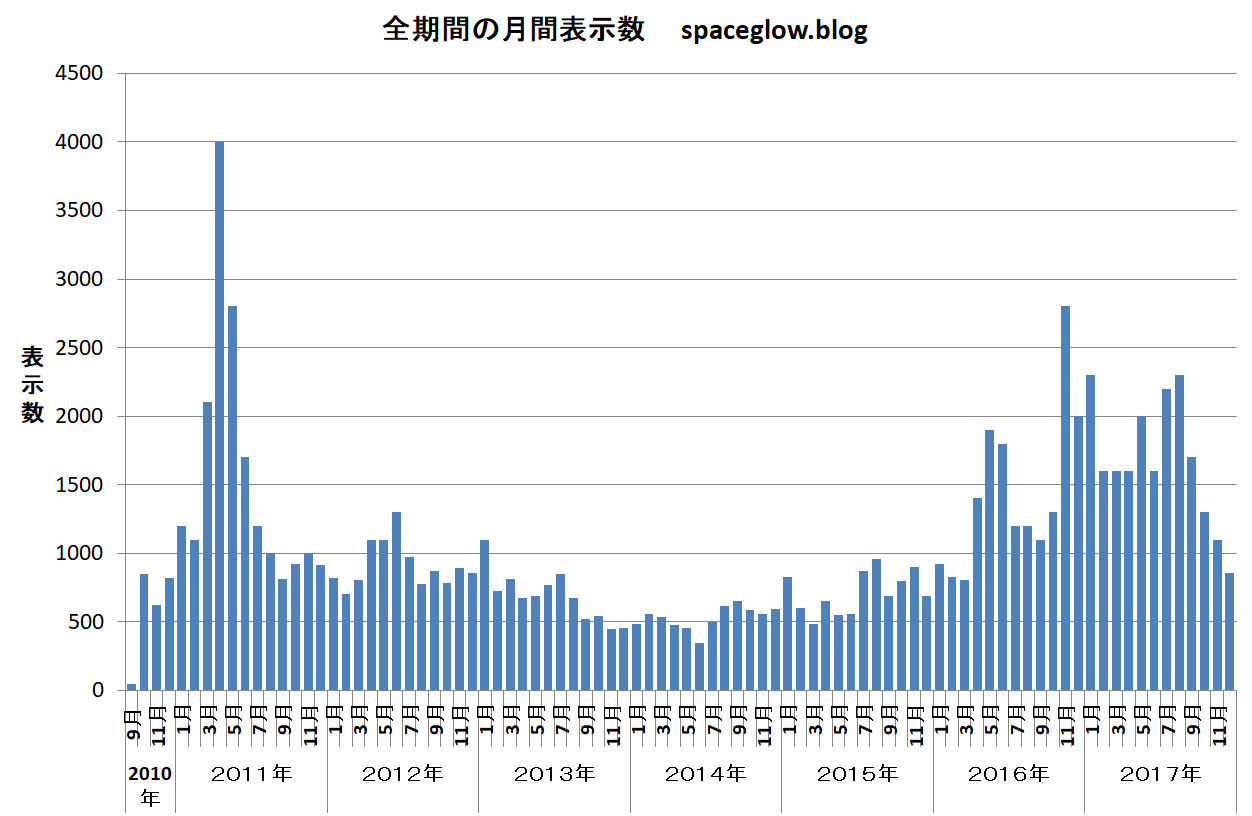 ワードプレス・ブログに書いた2010年9月からの月毎表示数をグラフにしてみました。