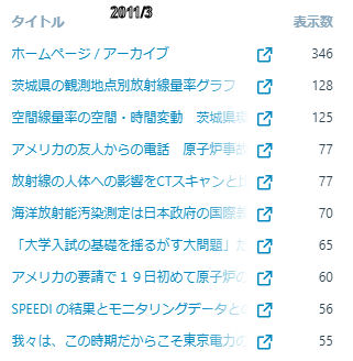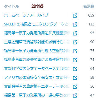2011年3月11日、東京電力福島第一原子力発電所のメルトダウン事故からの放射能災害が発生した年。放射能汚染に関し収集可能であったわずかの公表データーベースから私が分析投稿した幾つかの記事の積算参照数は現在までで1万表示あまり、1投稿タイトル当たりの参照数は130。1か月あたりの参照数の最大値2011年4月はいまだに破られていません。