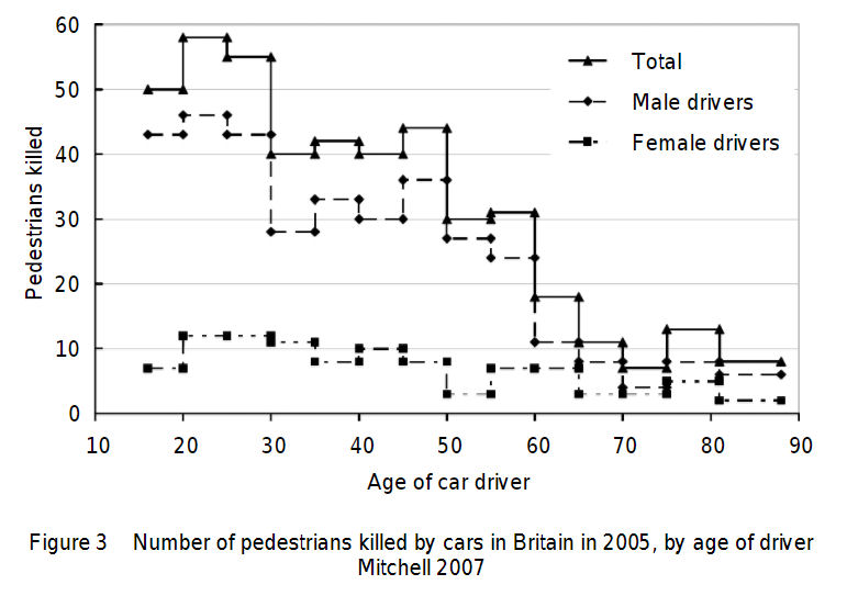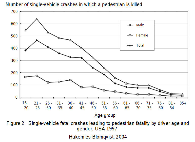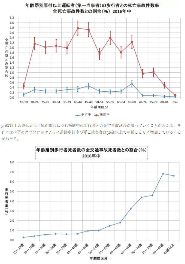 日本でも、高齢運転者の歩行者死亡事故に関与した第一当事者数は、中年以上年齢とともに減少している。それに反し歩行者死亡率は年齢とともに増加している。これが実勢の証拠である。