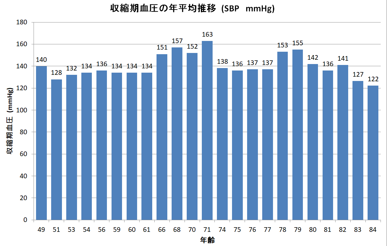 この期間中の血圧測定値は66歳までは医療機関(人間ドック)の記録から、67歳から81歳までは手首血圧計による朝晩の測定、82歳からはABPM機器による30分毎の連続自由生活測定値より平均したもので、測定システム間の誤差が考えられる。