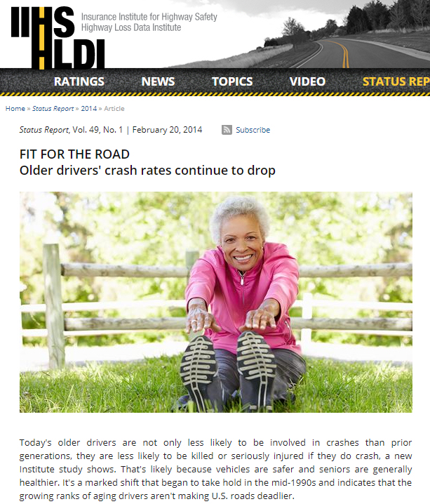 10年以上前、当研究所は当初65歳以上の高齢運転者が溢れるアメリカの道路のリスクを懸念している高速道路安全団体であった。2006年までに、予測された問題、致命的な事故データは現れなかった。2008年までのデータの追跡調査でその傾向が確認された。