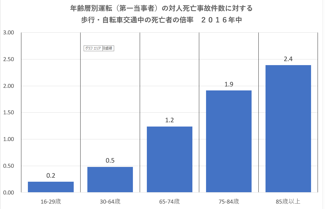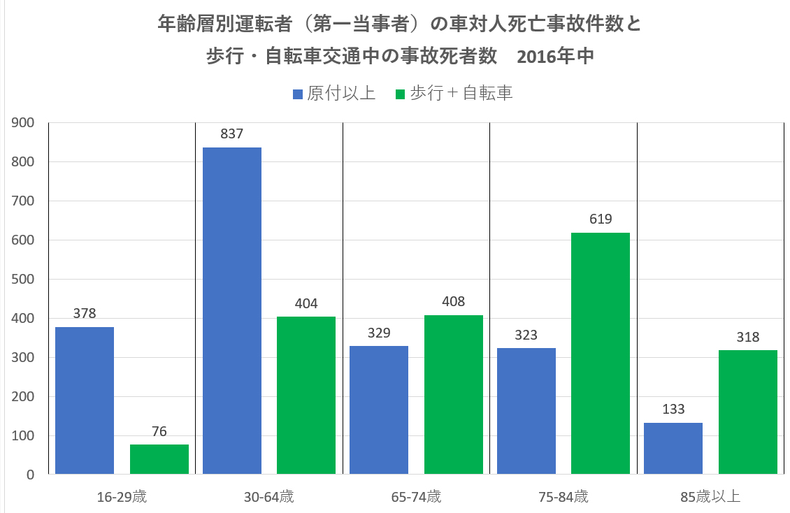 これを見て、高齢者人口は少ない、このグラフは各年齢層間の人口の違いを無視している非科学的なものという声が聞こえそうだが考えてほしい、これは2016年中の日本の道路交通の実勢数であり、人的交通災害の大きさの社会的実態を表す資料である。よくやられる人口や運転免許保持者10万人当たりに換算した数値は、全年齢層が同一人口の均一な母集団と見た場合で、現実にはあり得ない仮想のものである、これを社会的な政策の基準データとするのは間違いである。
