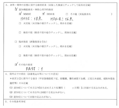 認知症の重症度判定の評価スケールであるFASTで1にチェックが入っていることです。FAST 1は、「認知機能の障害がない」であり「正常」に該当する項目です。病名にアルツハイマー型認知症と記載している限り、このFAST 1にチェックが入るのは整合性に欠けている様です。この診断書は公安委員会にとっては余分なことを書いた迷惑なもののようです。