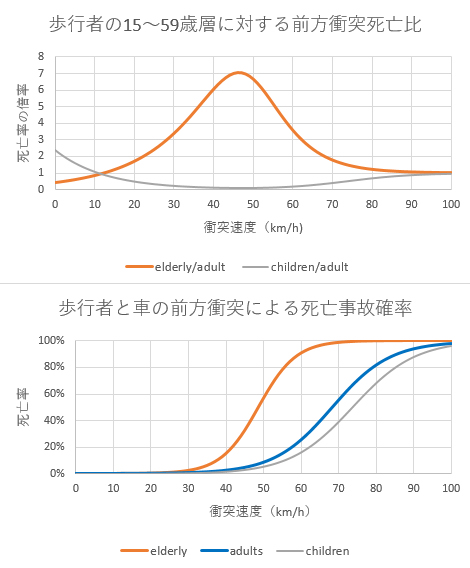 下のグラフは、近似式による高齢者層と一般年齢層との歩行中事故死者率を描いたものである。歩行中に自動車の正面衝突による死亡率は速度が上がるごとに上昇するが高齢者層のリスクは、衝突速度45km/hの時非高齢者の7倍にもなる。これをピークに80km/h以上に向かってこの比率1に近づく。この衝突速度の領域では非高齢者の死亡率も高くなり両年齢層とも生存者がなくなるからである。