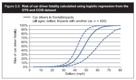 下図は、車同士の正面衝突時の速度変化(Delta-v)と運転者の死亡リスクの関係を計算したものである。高齢歩行者がほぼ100%死亡する40mph(64km/h)の時運転者の死亡リスク(全年齢)は20%程度であることがわかる。